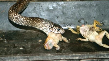 - Thức ăn của rắn trưởng thành chủ yếu là chuột, cóc, ếch, nhái…Rắn bắt mồi bằng cách đớp, ngoạm, răng cong vào trong nhờ cấu tạo của xương hàm mở rộng nên có thể nuốt được những con mồi lớn.